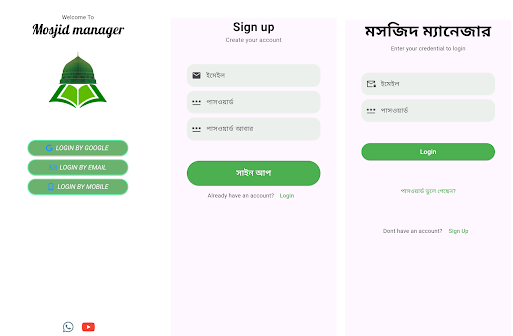 মসজিদ ম্যানেজার অ্যাপসে সাইন আপ, সাইন ইনঃ মসজিদ ম্যানেজার অ্যাপসে কয়েক মাধ্যমে লগইন করা যায়, এর মধ্যে গুগল একাউন্ট এর মাধ্যমে লগইন, ফেসবুক একাউন্টের মাধ্যমে লগিন এবং মোবাইল ফোন নাম্বার দিয়ে ওটিপি এবং ইমেইলের মাধ্যমে সাইন আপ, সাইন ইন করা যায়।